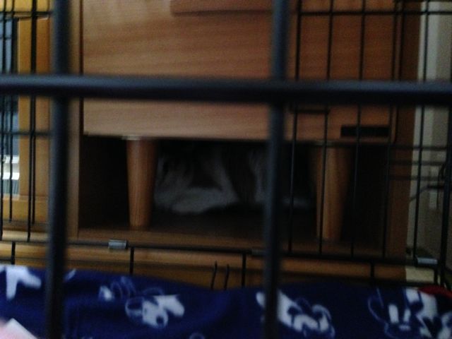 今度は和室に逃げ込み、サイドテーブルの下に潜り込んだまま。